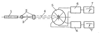 圖 2—21 激光準(zhǔn)直儀工作原理 1—氦氖激光器 2—平行光管 3—針孔光闌 4—激光束 5—光電探測(cè)器(四象限靶) 6—運(yùn)算電路 7—指示電表